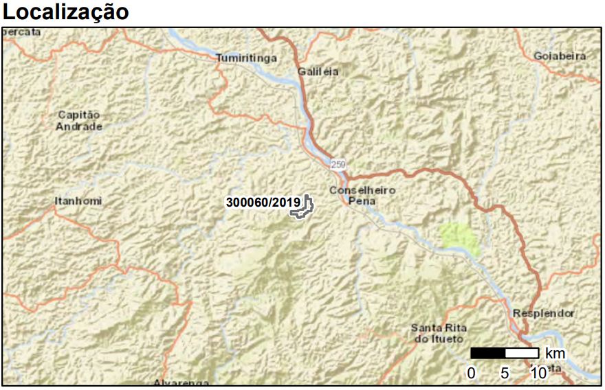 Número do processo minerário ANM: 300.060/2019 Fase atual: Disponibilidade Substância Mineral: Granito Área (ha): 334,68 Município: Conselheiro Pena Estado: Minas Gerais Descrição: Área aguardando Oferta Pública. […]- Data