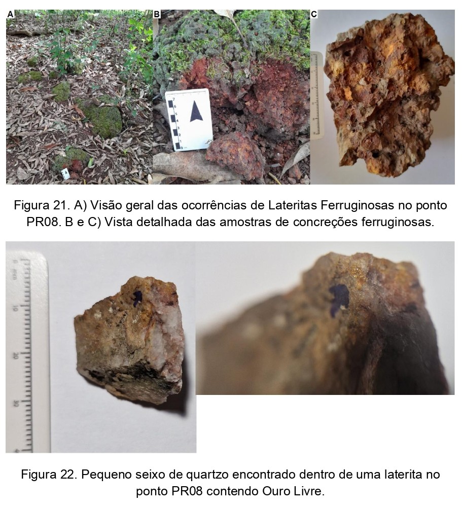 Geologia: Foi realizado o mapeamento geológico na poligonal desse direito minerário obtendo resultados promissores para a mineralização de ouro. Por intermédio do mapeamento geológico local foi possível definir as principais zonas de interesse e delimitar as feições geológicas que sejam mais favoráveis à mineralização de ouro. Dessa forma, foi constatada a predominância dos litotipos ortognaisse, gnaisse migmatítico e concreções ferruginosas.
