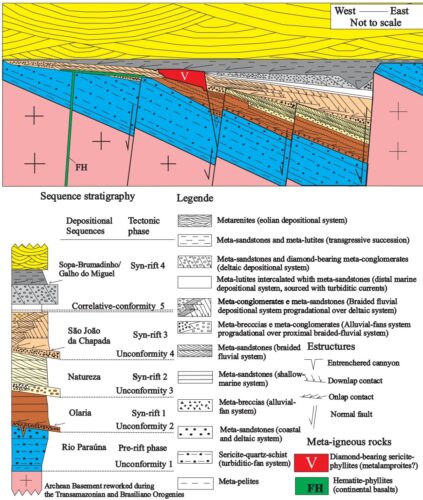 Contexto Geológico: O mapeamento geológico detalhado da região de Sopa e Guinda demonstrou que um corpo de rochas meta-ígneas encontra-se posicionado de forma discordante dentro da Sequência São João da Chapada. Em planta, trata-se de um corpo com forma irregular, apresentando aproximadamente 900 metros de largura máxima e comprimento máximo de 2,3 km. Em perfil, o corpo tem a forma de uma taça de champanhe, afunilando para baixo até uma profundidade de mais de 300 metros, onde acunha. Apesar dos sericita filitos que constituem o corpo ígneo serem menos resistentes mecanicamente que os metarenitos encaixantes, o fato de existir uma canga laterítica atual (“chapéu de ferro”) recobrindo o corpo, fez com que este fosse preservado da erosão em detrimento das rochas encaixantes. O corpo em planta do sericita filito de Diamantina foi comparado com caldeiras lamproíticas típicas.