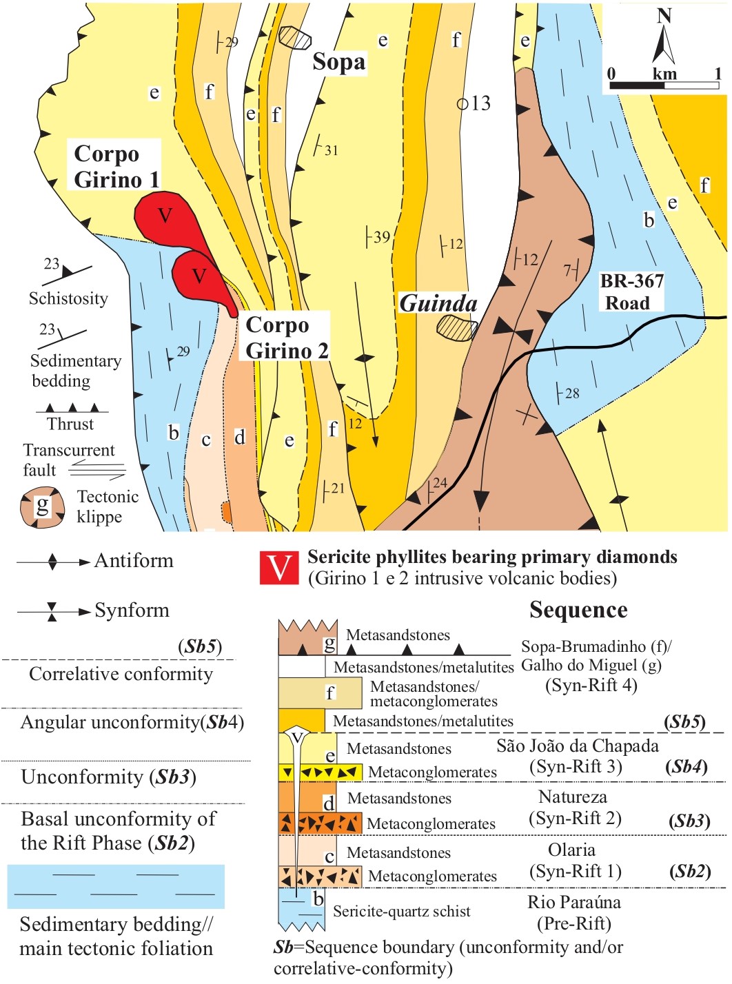 A pesquisa realizada apresenta dados disponíveis a respeito das rochas e sedimentos diamantíferos presentes na área. Oferece ainda sugestão interpretativa quanto a possibilidade de um terceiro depósito diamantífero na área: Os sericita-filitos do Distrito de Sopa-Guinda podem ser interpretados como rochas metamórficas a partir de protólitos de corpos ígneos intrusivos e extrusivos lamproíticos; na forma de diques, edifícios vulcânicos (isolados ou coalescentes) e ocorrem na forma de derrames vulcânicos. Foram identificados dois edifícios vulcânicos reliquiares na área. Estes edifícios são coalescentes e juntos formam o corpo denominado de “Girino”, que possui comprimento de 2,3 km e largura de 900 m.