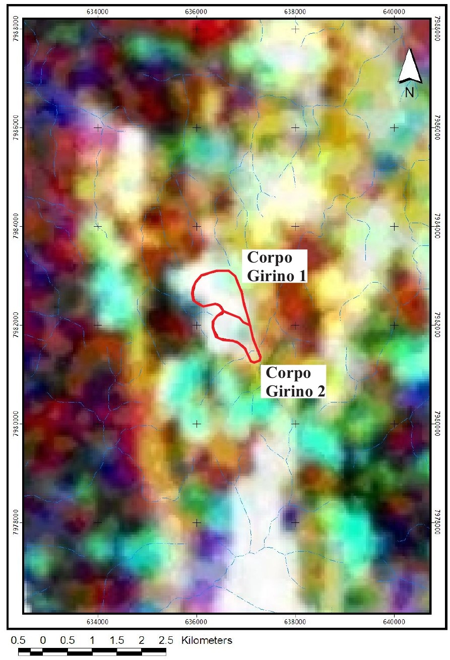 Mapa geológico de detalhe da área pesquisada (escala original de mapeamento=1:25.000). Os corpos Girino 1 e 2, de sericita filitos diamantíferos, afloram em uma área contínua com mais de 100 hectares.