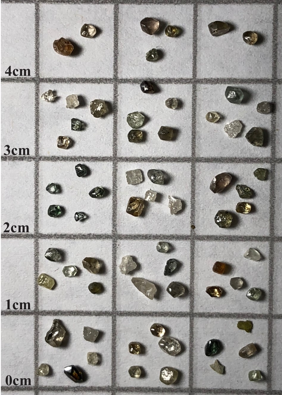 O material retirado destes poços/trincheiras, correspondeu à aproximadamente 100m3, tendo sido beneficiado e recuperados 67 (sessenta e sete) diamantes, totalizando 3,06 ct de diamante. Pode-se então calcular um teor de 0,03 ct/m3 de diamantes, encontrados nestas coberturas quaternárias hoje depositadas na camada superficial do corpo Girino 1.