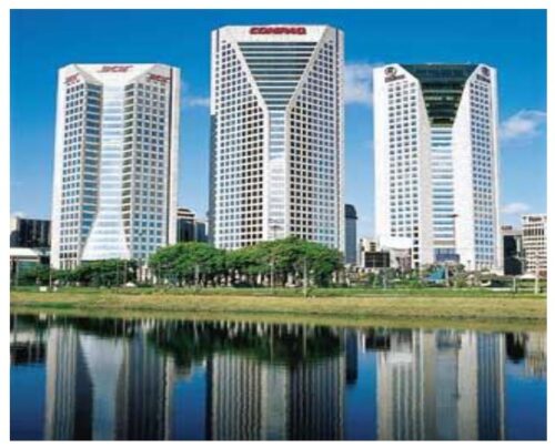 Foto da obra Internacional do Centro Empresarial Nações Unidas-CENU/São Paulo -SP. Torres revestida externa e internamente pelo granito Kashmir Bahia.