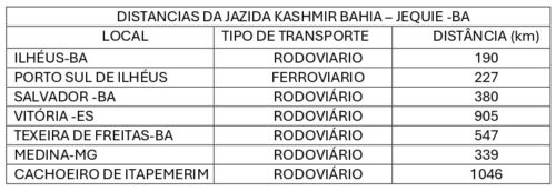 A tabela a seguir apresenta as distâncias da jazida Kashmir Bahia para os principais portos e polos de serrarias.