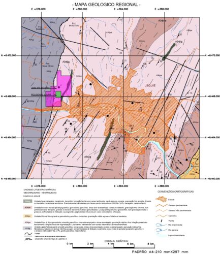 Geologia da Área: Dentro dos limites da poligonal delimitadora da área, a litologia está representada por predominantemente por leucognaisses, constituindo-se numa estreita faixa de rochas supracrustais, e por rochas básicas, ambas concordantes com “trend” regional de direção NE.