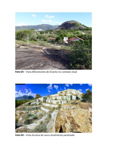 A área em questão referente ao Processo ANM nº 870.609/1991, encontra-se perante a Agência Nacional de Mineração em situação ativa, e status atual de Requerimento de Lavra. Com o Alvará de Pesquisa Nº 2.632 publicado no D.O.U de 26/08/1993, a Granito Branco Mineração Ltda, apresentou tempestivamente o Relatório Final de Pesquisa Positivo para a substância mineral GRANITO em 23/08/1996. Durante os trabalhos pesquisa, foram solicitadas e emitidas duas Guias de Utilização. A primeira, G.U nª 004/96 de 09/08/1996, com vencimento em 09/02/1997, e a segunda G.U nª 004/97 de 17/04/1997 com vencimento em 16/10/1997, ambas com 600 m³ (seiscentos metros cúbicos) para extração da substância mineral granito. sendo aprovado pela ANM com redução da área para 535 hectares e publicado no Diário Oficial da União. Em 06/02/1998, o processo em pauta, obteve a aprovação do RPPM publicada no DOU. Em 08/09/1999 foi protocolado o Plano de Aproveitamento Econômico. Em 19/03/2003 foi protocolado os seguintes documentos: requerimento de Guia de Utilização; Plano de Controle de Impacto Ambiental na Mineração – PCIAM; Plano de Resgate e Salvamento-PRS; Plano de Fechamento, Suspenção e Retomada das Operações Mineiras-PFM. Em 25/04/2023 foi protocolado Requerimento de Guia de Utilização para lavrar 16.000 (dezesseis mil) toneladas /ano de granito para revestimento. Em 15/04/2024 foi protocolado o cumprimento tempestivo da exigência formulada referente aos seguintes documentos: Plano de Gerenciamento de Riscos -PGR; Plano de Resgate e Salvamento-PRS; Plano de Fechamento de mina-PFM.