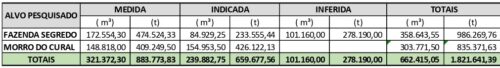 Cubagem da Jazida Mineral: O Relatório Positivo Final de Pesquisa Mineral, referente ao processo ANM 870.607/1991, aprovado pela Agência Nacional de Mineração, publicado no Diário Oficial da União, em 06/02/1998, aprovou os recursos geológicos, apresentados resumidamente na tabela a seguir: