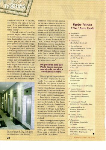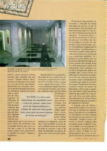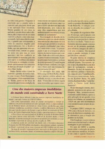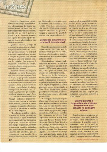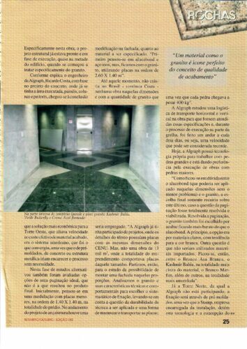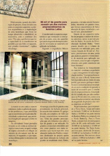 No item 5, Geologia da Área ANM 870.609/1991(adiante), será apresentado os resultados os índices referentes aos ensaios físicos – mecânicos e sua composição mineralógica, realizados no Instituto de Pesquisas Tecnológicos do Estado de São Paulo – IPT. Em uma série de avaliações entre diversos granitos de tonalidade branca no Brasil, o Kashmir Bahia foi selecionado para obra internacional da CENU-Centro Empresarial das Nações em São Paulo -SP, por atender as rigorosas especificações físico-mecânicas e estéticas. Foi fornecido para esta obra 86.000 m² para revestimentos. O artigo “Kashmir Bahia impõe personalidade ao Centro Empresarial Nações Unidas” da Revista Rochas de Qualidade narra com detalhes a sua aplicação. Recomenda-se a leitura deste artigo em anexo.
