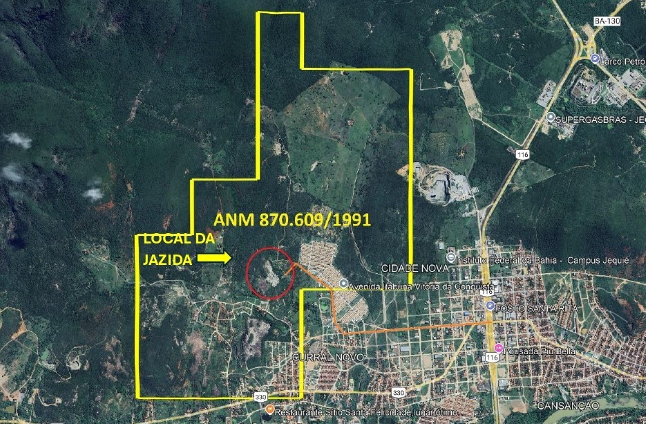 Localização da jazida em relação a cidade de Jequié e sua poligonal delimitadora. A linha em cor laranja, indica o acesso BR-116-jazida.
