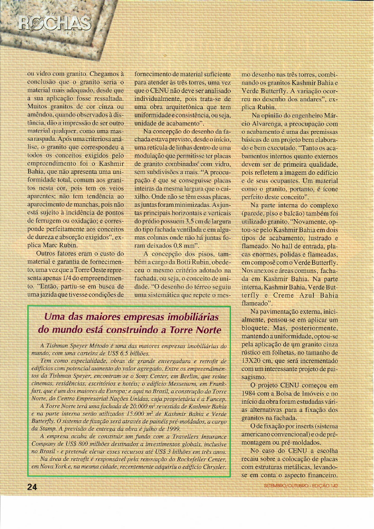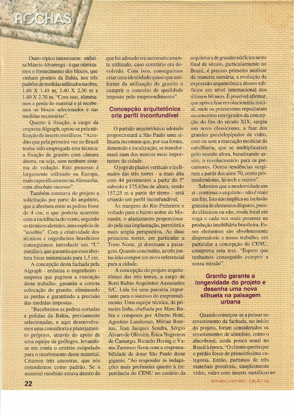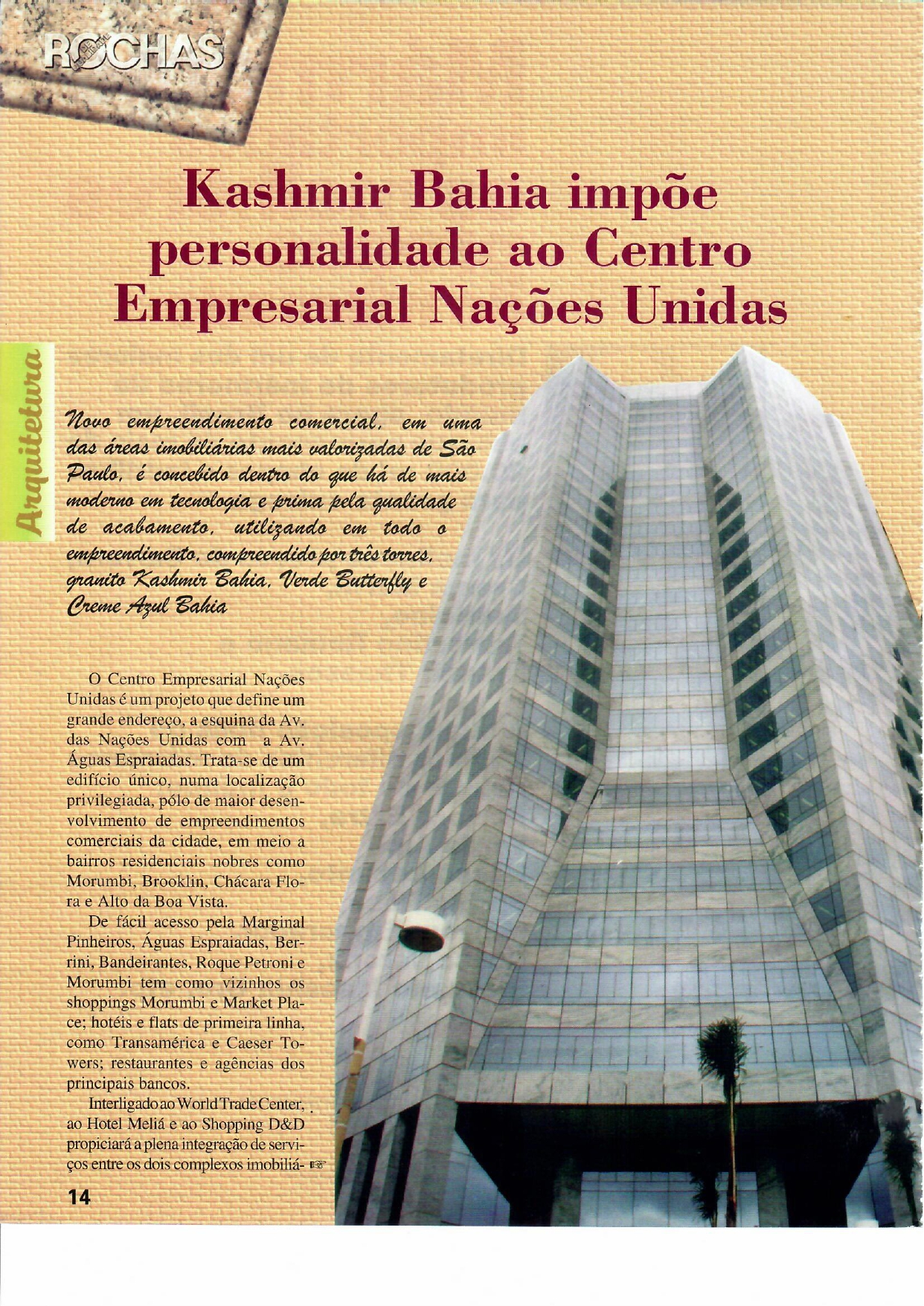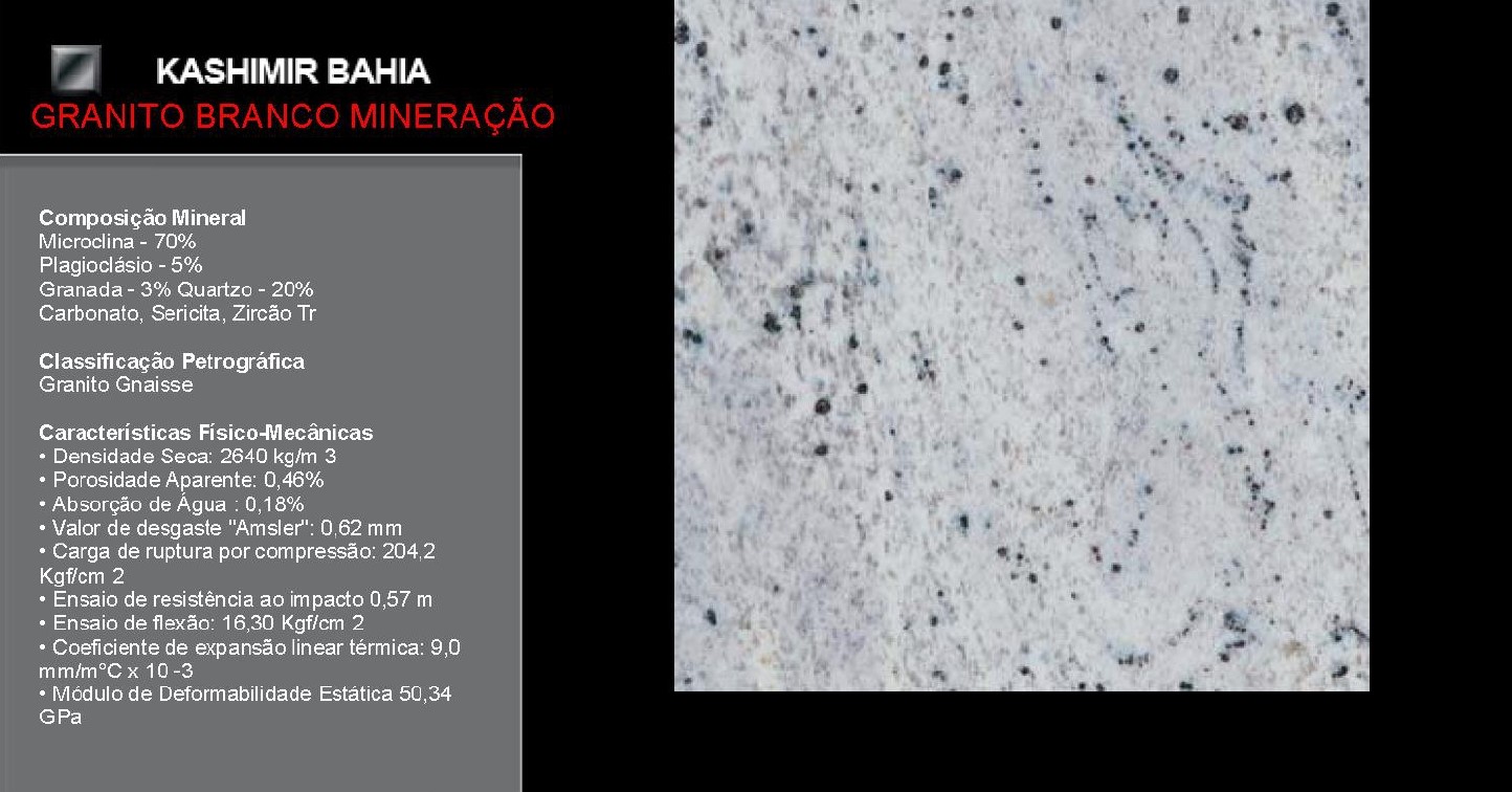 No item 5, Geologia da Área ANM 870.609/1991(adiante), será apresentado os resultados os índices referentes aos ensaios físicos – mecânicos e sua composição mineralógica, realizados no Instituto de Pesquisas Tecnológicos do Estado de São Paulo – IPT. Em uma série de avaliações entre diversos granitos de tonalidade branca no Brasil, o Kashmir Bahia foi selecionado para obra internacional da CENU-Centro Empresarial das Nações em São Paulo -SP, por atender as rigorosas especificações físico-mecânicas e estéticas. Foi fornecido para esta obra 86.000 m² para revestimentos. O artigo “Kashmir Bahia impõe personalidade ao Centro Empresarial Nações Unidas” da Revista Rochas de Qualidade narra com detalhes a sua aplicação. Recomenda-se a leitura deste artigo em anexo.