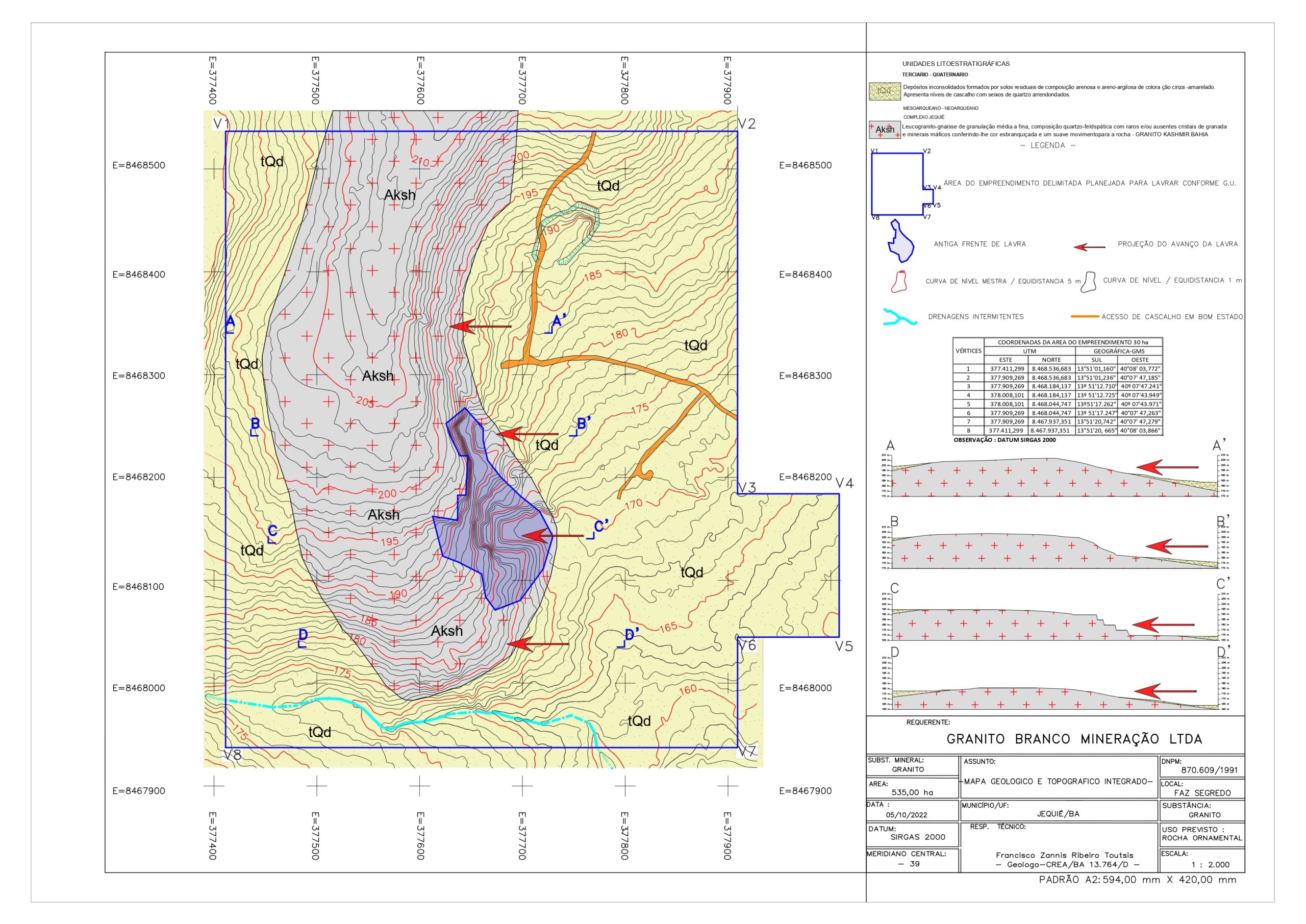 A área em questão referente ao Processo ANM nº 870.609/1991, encontra-se perante a Agência Nacional de Mineração em situação ativa, e status atual de Requerimento de Lavra. Com o Alvará de Pesquisa Nº 2.632 publicado no D.O.U de 26/08/1993, a Granito Branco Mineração Ltda, apresentou tempestivamente o Relatório Final de Pesquisa Positivo para a substância mineral GRANITO em 23/08/1996. Durante os trabalhos pesquisa, foram solicitadas e emitidas duas Guias de Utilização. A primeira, G.U nª 004/96 de 09/08/1996, com vencimento em 09/02/1997, e a segunda G.U nª 004/97 de 17/04/1997 com vencimento em 16/10/1997, ambas com 600 m³ (seiscentos metros cúbicos) para extração da substância mineral granito. sendo aprovado pela ANM com redução da área para 535 hectares e publicado no Diário Oficial da União. Em 06/02/1998, o processo em pauta, obteve a aprovação do RPPM publicada no DOU. Em 08/09/1999 foi protocolado o Plano de Aproveitamento Econômico. Em 19/03/2003 foi protocolado os seguintes documentos: requerimento de Guia de Utilização; Plano de Controle de Impacto Ambiental na Mineração – PCIAM; Plano de Resgate e Salvamento-PRS; Plano de Fechamento, Suspenção e Retomada das Operações Mineiras-PFM. Em 25/04/2023 foi protocolado Requerimento de Guia de Utilização para lavrar 16.000 (dezesseis mil) toneladas /ano de granito para revestimento. Em 15/04/2024 foi protocolado o cumprimento tempestivo da exigência formulada referente aos seguintes documentos: Plano de Gerenciamento de Riscos -PGR; Plano de Resgate e Salvamento-PRS; Plano de Fechamento de mina-PFM.