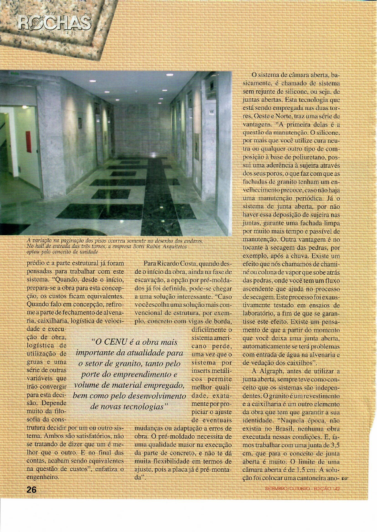 O complexo do CENU / São Paulo – SP, composto pelas Torres Norte, Leste e Oeste, com 34, 25, e 25 pavimentos respectivamente, está totalmente revestido por pelo granito Kashmir Bahia utilizando-se de uma tecnologia alemã de ancoragem (fixação) das placas/ladrilhos nas estruturas destes arranha-céus. Essa tecnologia, inédita no Brasil, envolve a aplicação de “inserts” em aço inox. De acordo com a equipe de engenharia da construtora CENU, devido as alturas dos empreendimentos, força dos ventos, umidade e constantes oscilações de temperaturas, , a tecnologia de fixação empregada só foi possível graças às características físico-mecânicas do granito Kashmir Bahia.